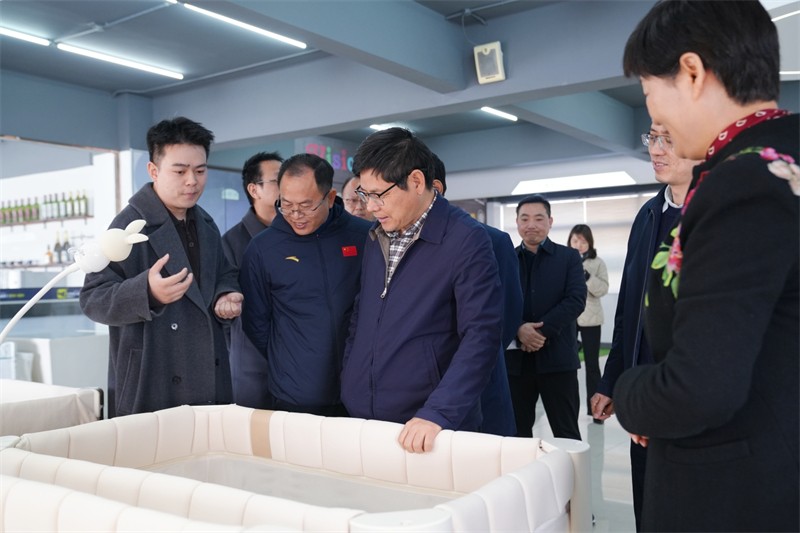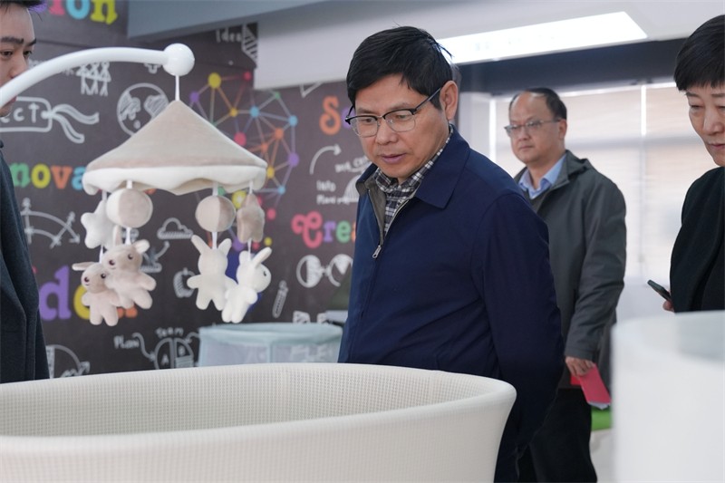 吴劲松同志首先前往了酷豆丁样品间进行参观,张迎年董事长详细介绍了公司最新研发的智能婴儿床等智能产品,展示了这些产品在创新技术方面的突破。随后,调研组前往酷豆丁的质量检测实验室,实地观摩了产品的检验过程,进一步了解了酷豆丁在保障产品质量和消费者体验方面所做的努力。